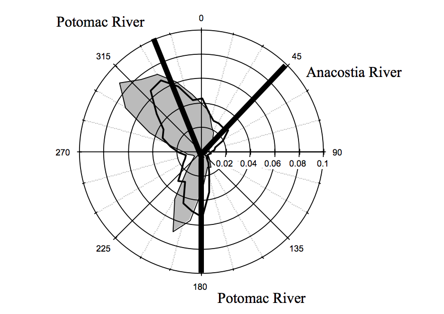And that’s not a coincidence that favored quarters on the east coast are often in the northwest. That’s because prevailing winds along the east coast are northwestern winds. This is definitely true in DC. Here’s a study that proves it! Here’s a graph of the winds in DC: