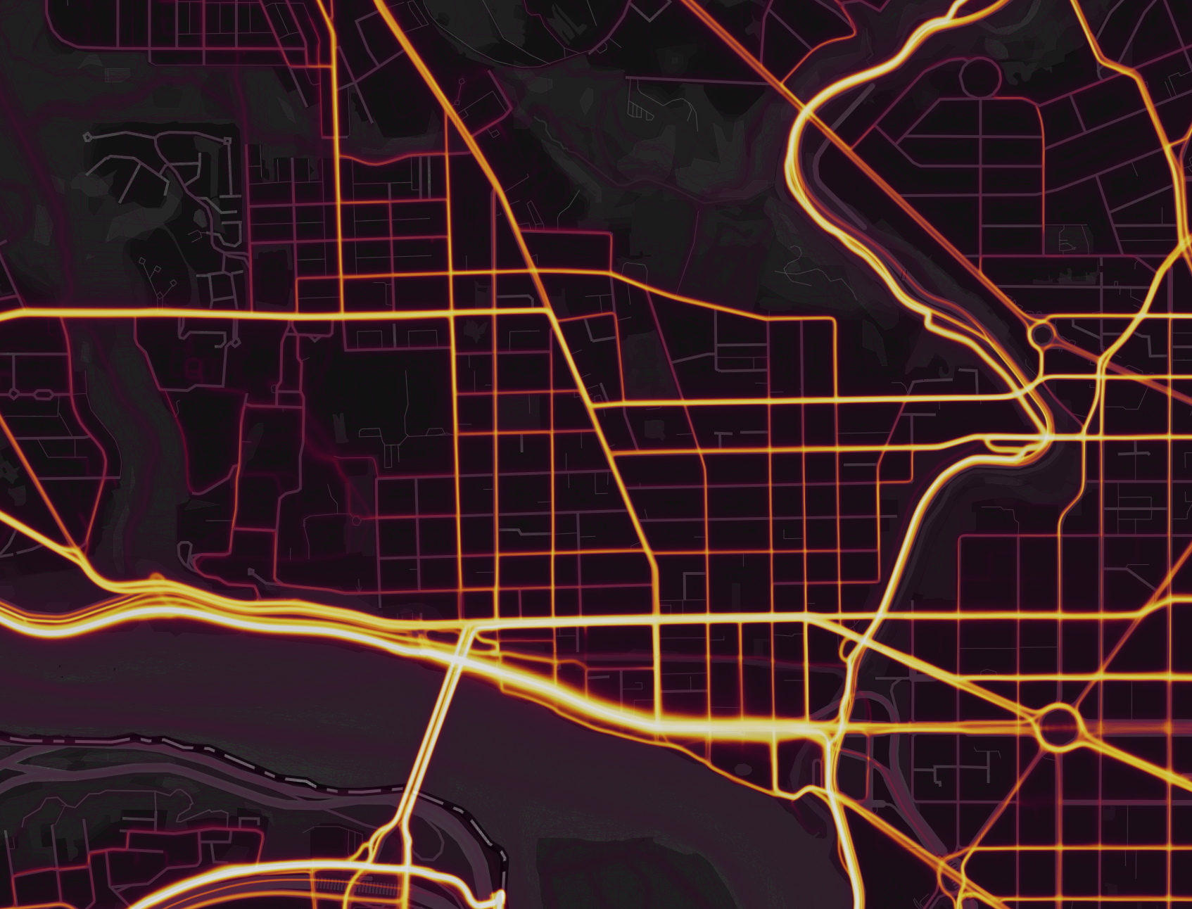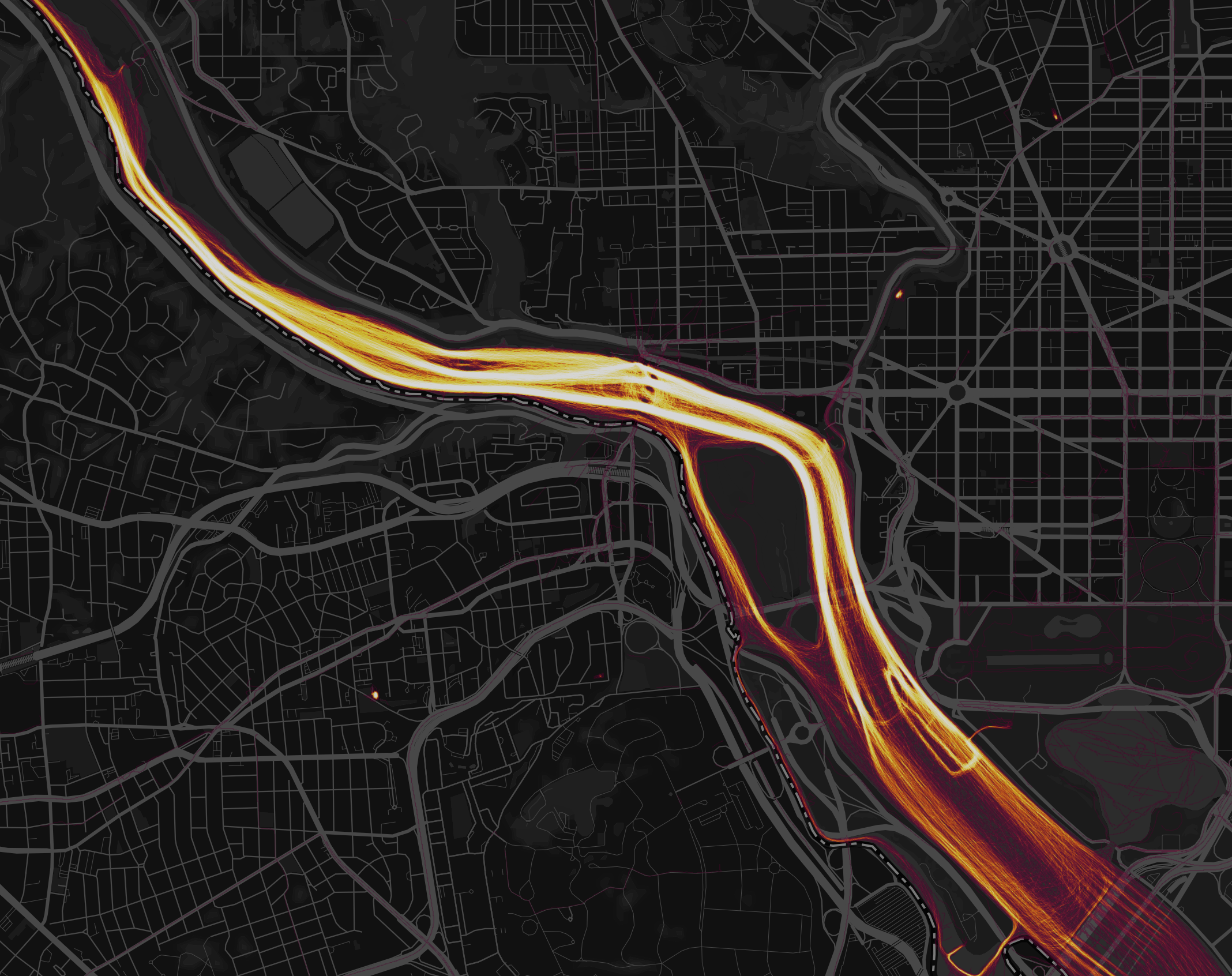 As you may have read how it unveiled secret bases around the world, the exercise tracking app, Strava, has released a world map showing the aggregate data of all its users. Essentially, they took the millions of routes its thousands of customers tracked and put it out for the public to review. So we can zoom into a place, like Georgetown, and see how Strava users get through the neighborhood.