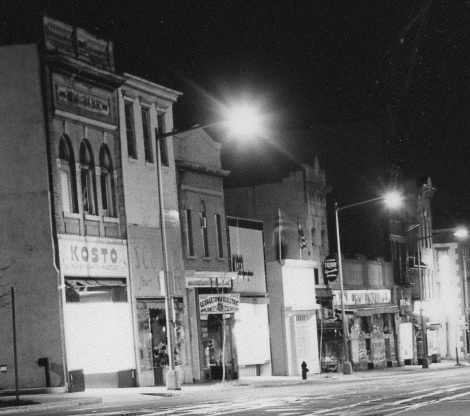 These are tenants GM has discussed before. Kosto was a craft store. Scotts was a shoe store. Georgetown Electric was an electronics store (there’s still a sign for Georgetown Electric on the back of the building, and the owner of the building is still listed as Georgetown Electric Co.). It’s hard to see the rest of the signs in the photo, but the wide building that now hosts Urban Outfitters was a Woolworth’s.