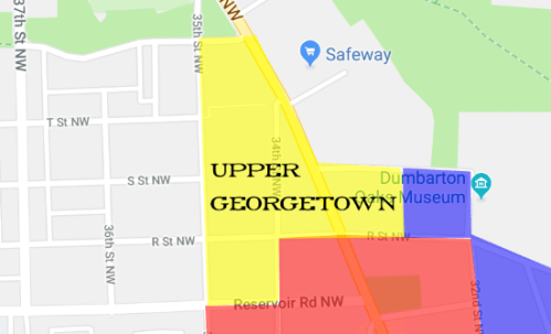 Upper Georgetown’s southern border is Book Hill, which comes to a natural northern end at the library. The eastern border is a bit fuzzier. GM figures that at some point between 32nd and Wisconsin, R St. and S St. stop being Georgetown Heights and start being Upper Georgetown, but it’s not a bright line.