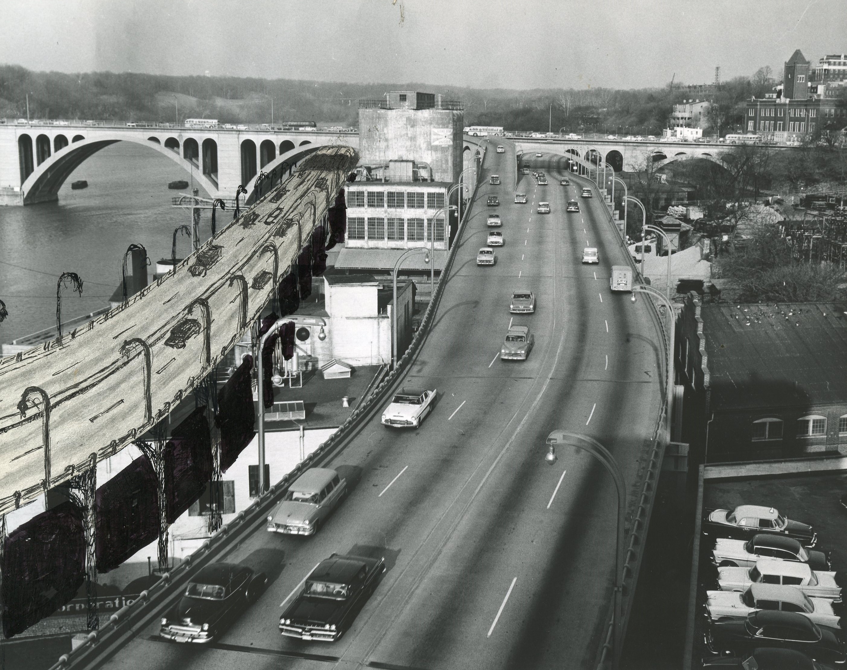 This week for Georgetown Time Machine: GM is visiting an odd item in DDOT’s collection. It’s a photo of the Whitehurst Freeway circa 1959, but there’s another Whitehurst sketched in beside it!