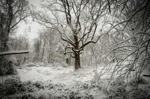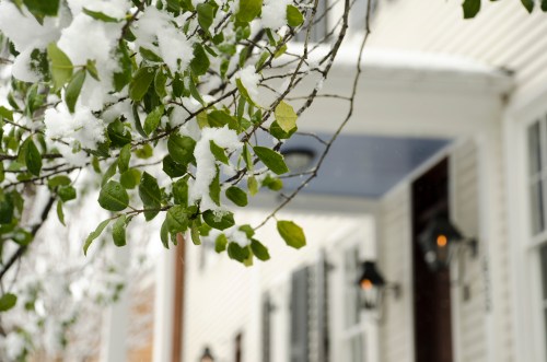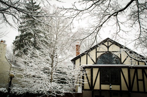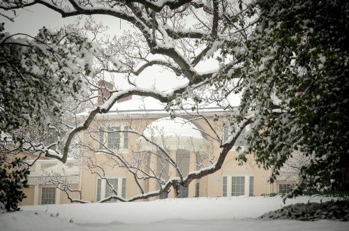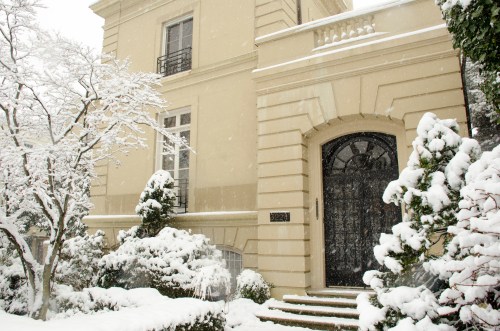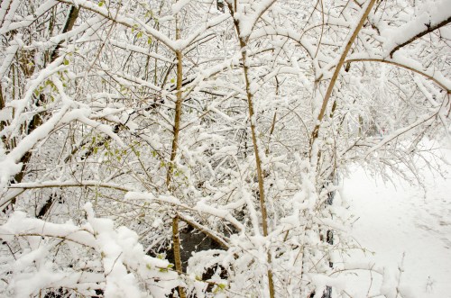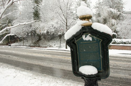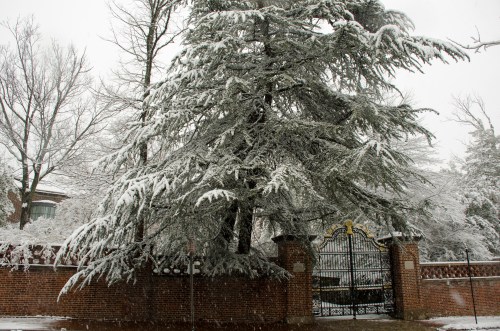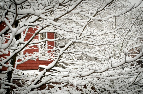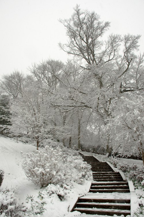 Normally “snowfall” in a Georgetown spring means lying underneath the cherry trees in Dumbarton Oaks as the blossoms cascade down. But yesterday brought genuine snow to spring. And the neighborhood is quite lovely in white.
