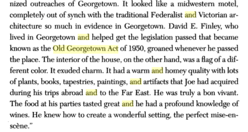 The excerpt touches on the other thing that makes this property famous: that it was journalist Joe Alsop’s house for decades and the scene of countless legendary dinner parties and conversations between the titans of Washington politics. It was the main stage of the famous “Georgetown Set” and as vividly retold in the book of the same name, Presidents, Secretaries of State, generals, editors in chief and others charted the course of the Cold War over cocktails within its walls.