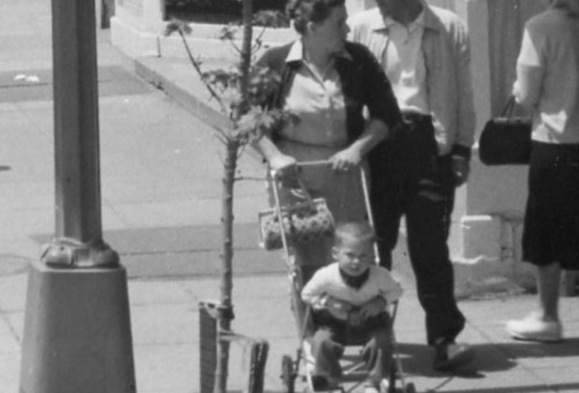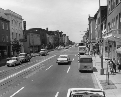 As for time, the DDOT library where it’s from doesn’t indicate what year it is. It’s really blurry, but GM thinks the plate from that van on the right says some year in the 1960s, and GM thinks it’s probably 1960: