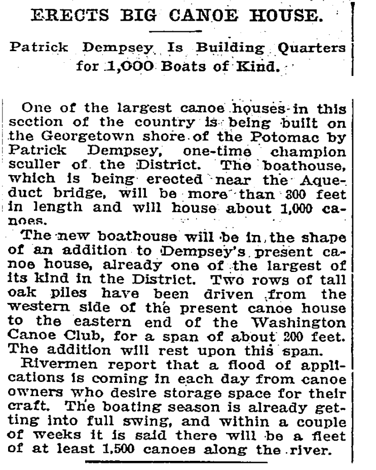 The next building is Dempsey’s Boathouse. It was built in prior in 1903 by Patrick Dempsey (this article is from 1914 and is about an expansion to the existing building):