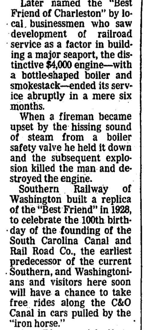 This is not a colorization of a genuine old shot. It’s from 1976. According to the photo’s site, it is Southern Railways’s “Best Friend of Charleston”. It was a 1928 replica of the first steam locomotive built entirely in the United States for the purpose of revenue service. It was brought to DC to celebrate the bicentennial. Here is a Post article about it: