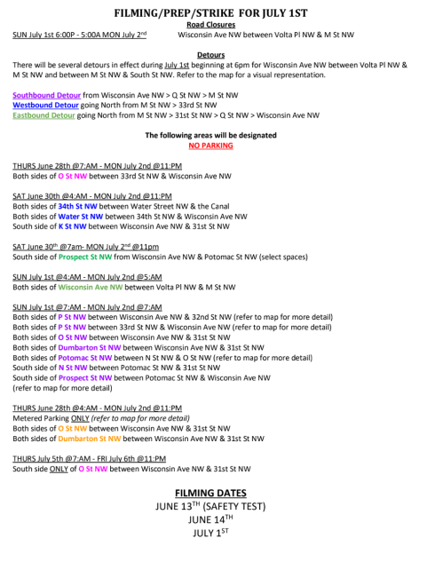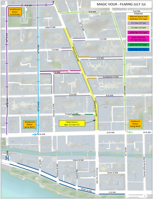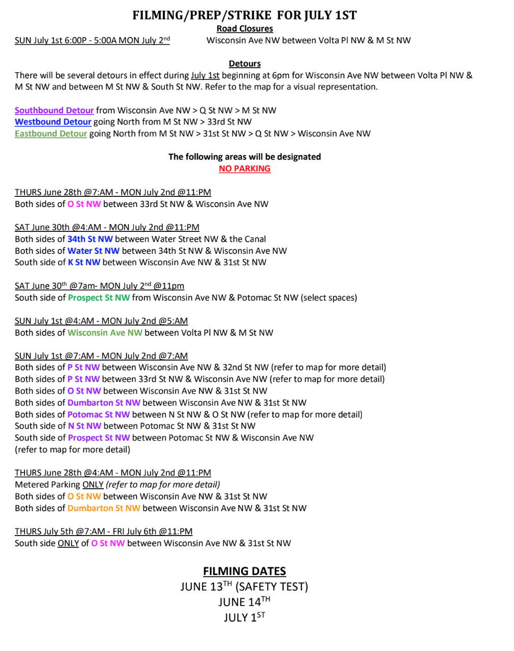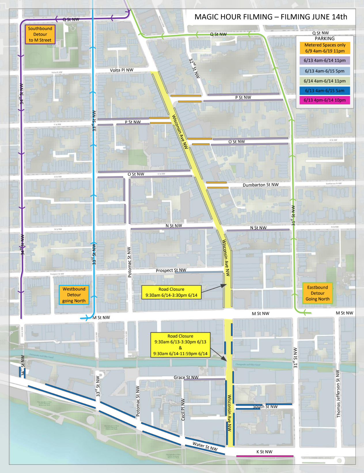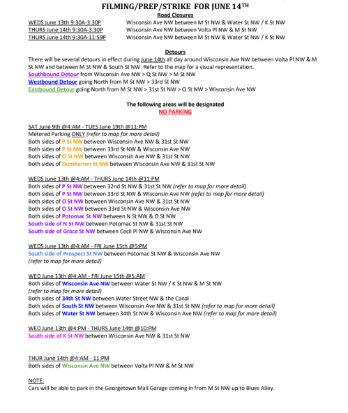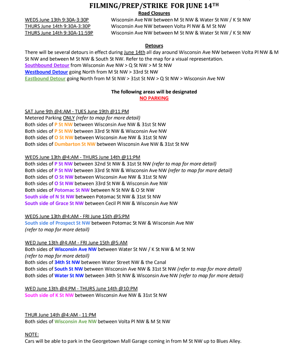 The filming itself will only take place on June 14th and July 1st. But there will be parking restrictions throughout that period, starting Saturday. On the days of filming, Wisconsin Ave. will be closed to car traffic all day. This will be quite a headache.