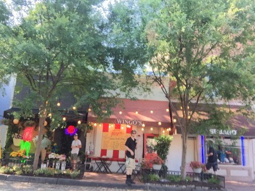 Wingo’s (which suffered a severe fire days before shooting) was given a retro sign. The English Rose, next door, was given a bunch of flowers for the sidewalk.