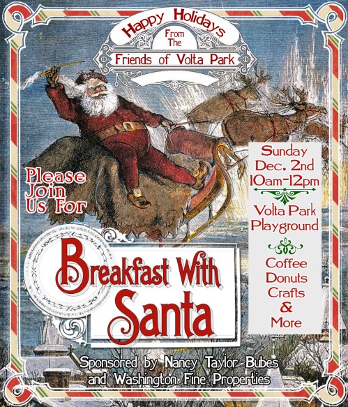 Come on out Dec. 2nd to Volta Park for the annual Breakfast with Santa! Proceeds go towards improving Volta Park. As always there will be coffee, donuts, and crafts. Photos (printed on site) will be available for purchase! See you then!