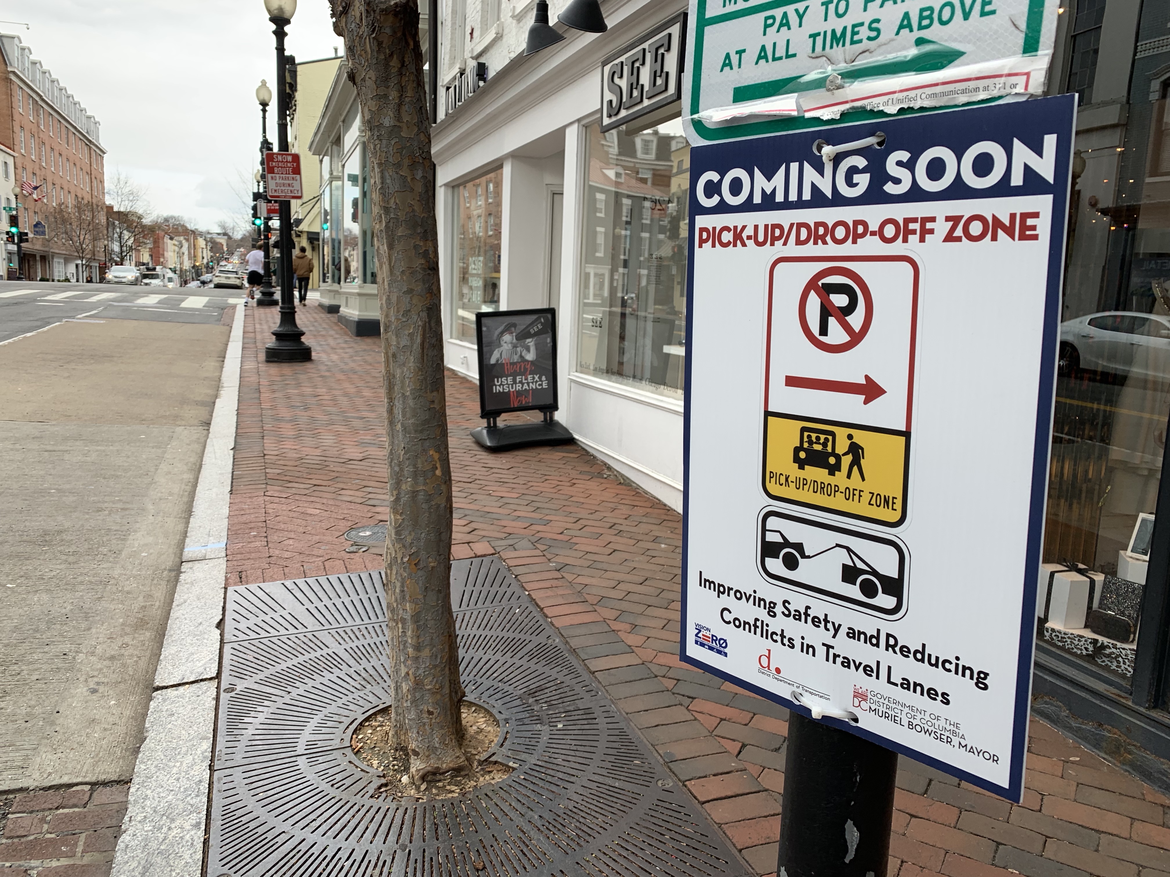 The eastside of the 1200 block of Wisconsin Ave. is soon going to be converted to a 24 hour pick-up/drop-off zone. What that means is that the right most lane of this block will be used only for loading or unloading or either passengers or goods. The parking will be eliminated.