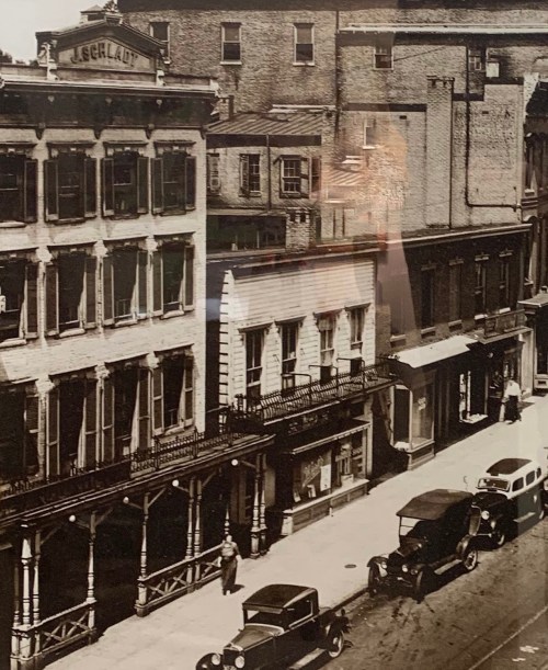 The capital on the top of the bigger building to the left is gone, and the paint scheme is far lighter these days, but the biggest difference is at the street level. It once have a wooden porch sort of facade. This is long gone.