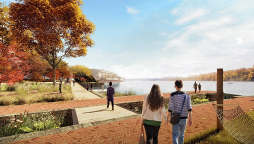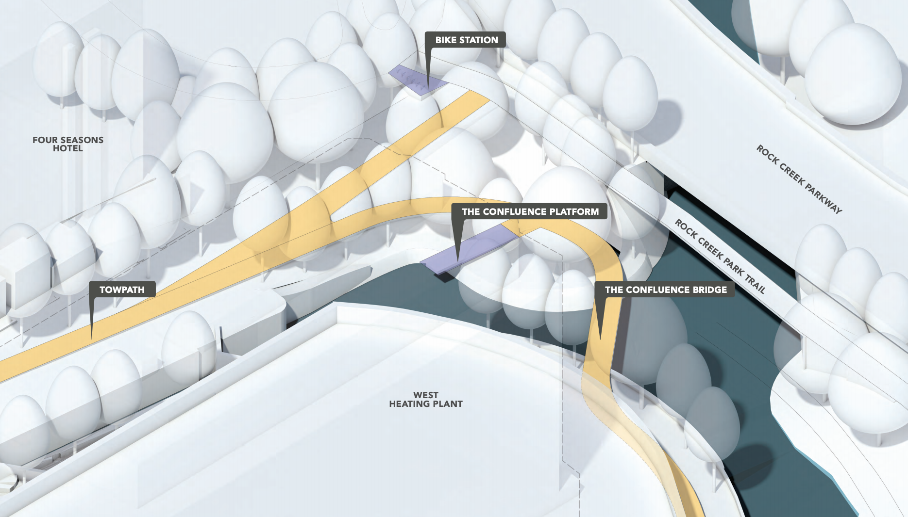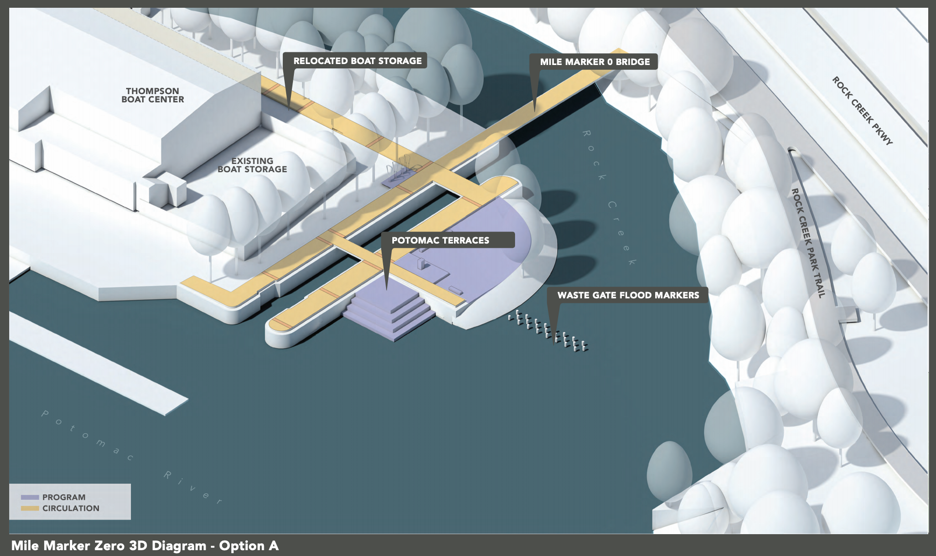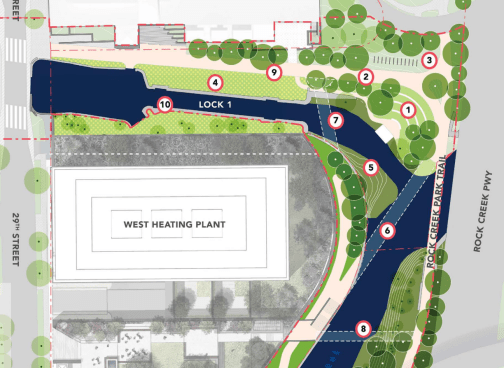 Like the first proposals, the plan breaks up this stretch into thematic sections. Starting at the eastern end is Mile Marker Zero. This is were both Rock Creek and the canal flow into the Potomac.