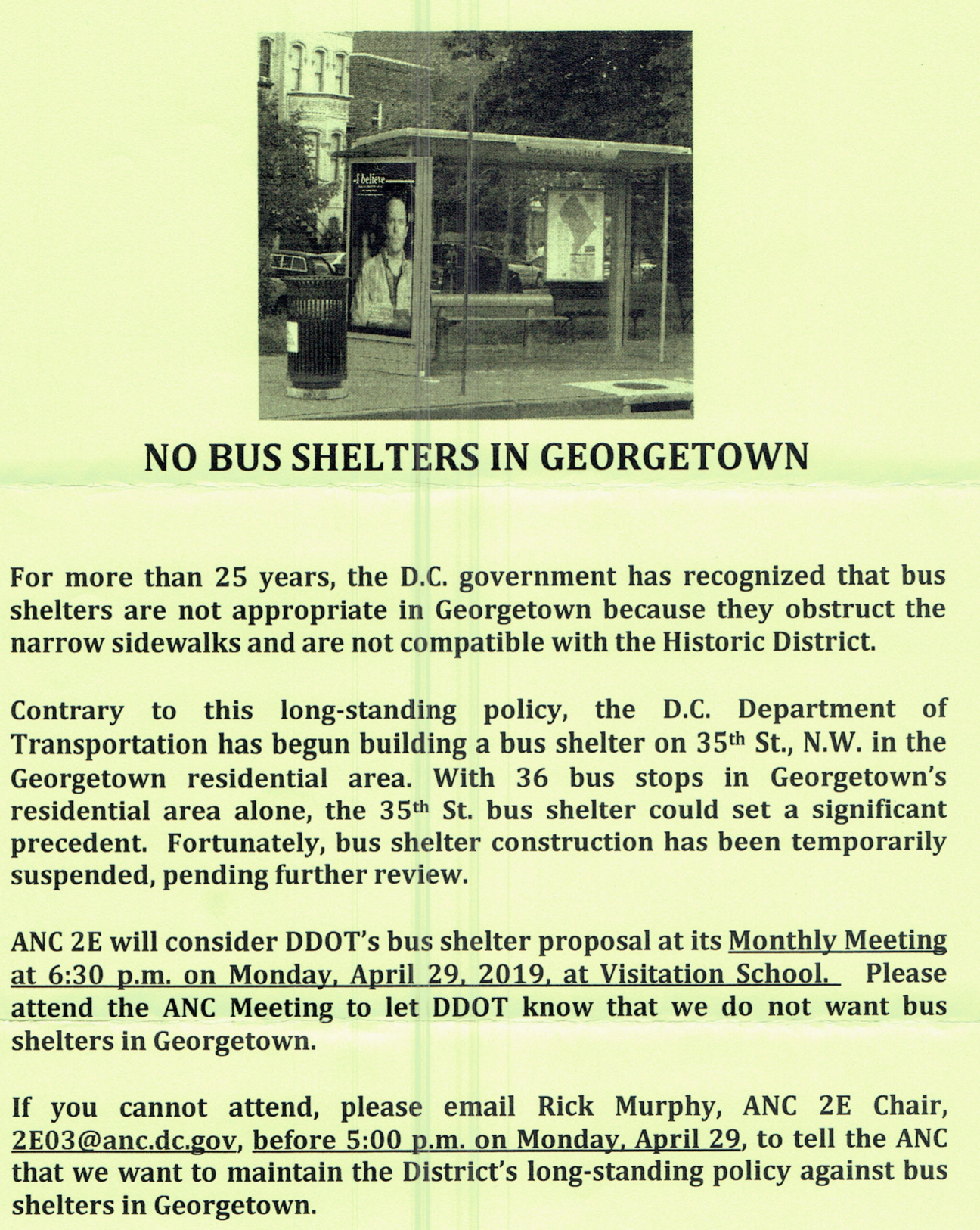Thanks, Brad. As one of the co-founders of the Georgetown Blue Bus (precursor to the D.C, Circulator) and someone who has commuted downtown via Metrobus for more than 30 years, I’ve done my share of waiting for buses, with and without bus shelters. Bus shelters certainly have their place in busy commercial areas with wide sidewalks and high ridership, but not in low-density historic districts like Georgetown. That was true 30 years ago when DDOT first implemented this policy, and it remains true today.