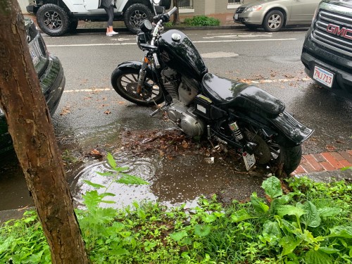 GM walked by this scene over the weekend. A motorcycle was parked with its wheel right up against the curb. This resulted in a mini flooding situation.
