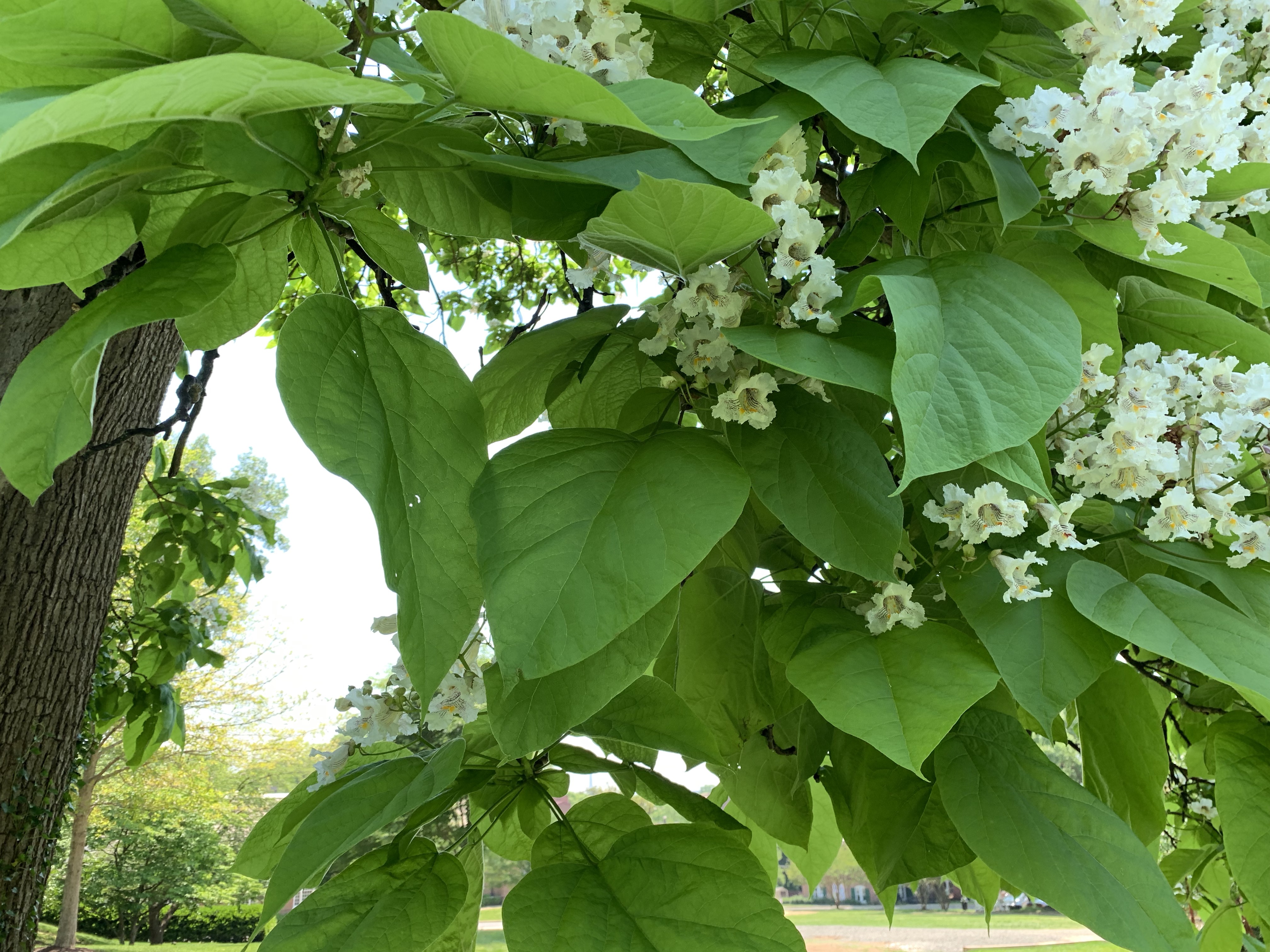 They have large elongated valentine heart shapes. The leaves in this picture (from Georgetown Visitation) are at least nine inches long. GM believes they are southern catalpas, but he’s not certain.