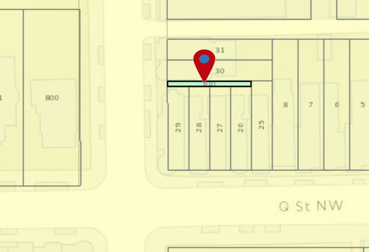 The list from the tax office states that the owner of the lot is unknown. The only record for the lot in the DC Recorder of Deeds is a record of a mortgage being paid off on the lot in 2001. The listed owners at that point don’t appear to live in DC anymore, nor own any of the surrounding properties.