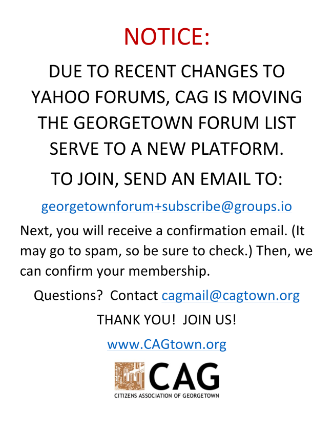 The above notice was sent to users of the Georgetown listserv by the Citizens Association of Georgetown. The old listserv is a Yahoo! group, and that platform is being shut down by whatever sad sack of a company ended up with Yahoo! (Verizon it turns out!). So CAG is moving it over to the Groups.io platform. To join, follow the instructions above and email georgetownforum_subscribe@groups.io.