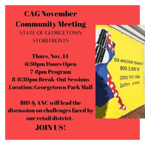 If you want a clearer answer, come on out to the joint BID-ANC event this Thursday night at the Georgetown Park Mall. After a talk on the current state of things, the group will break out into smaller groups to discuss the issues, such as what retail is desired, what can be done to facilitate their arrival, and other topics.