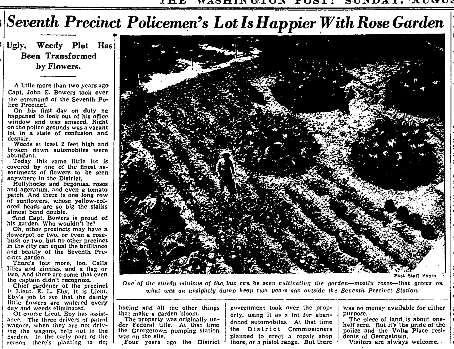 It tells the story of a new police captain moving into the station and being dismayed at the sorry state of the adjacent vacant lot. He enlisted his lieutenants to grow a flower garden. And where weeds and abandoned cars once stood, hollyhocks and begonias grew. “Visitors are always welcome” it concluded.
