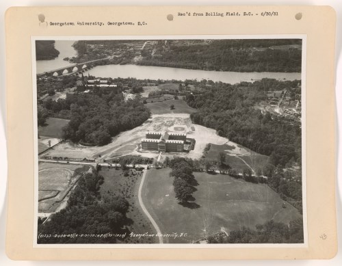 An elderly GU alumnus writes: thanks for these wonderful photos — the best aerial shots of “Old Georgetown” I have ever seen. So much detail, so many buildings identified that I had only heard about by word of mouth; for instance, note the little settlement of houses located roughly on the current site of GU’s gym, dorms, and the John Thompson Center. According to tradition they were an extended family/ies of rag pickers and junk dealers, who had lived there for many years, and who had to be compensated bu GU when the gym was built in about 1950, because they had acquired squatters’ rights. The wooded area to the north (below) the old buildings of the main campus was a series of rustic woodland paths and by-ways known to the students as “The Walks.” The trees were all cut, the stream beds buried, the hills and ravines graded and leveled, and buildings now stand on the site.