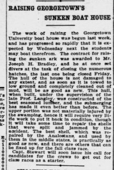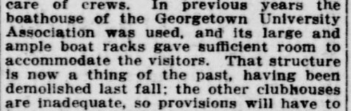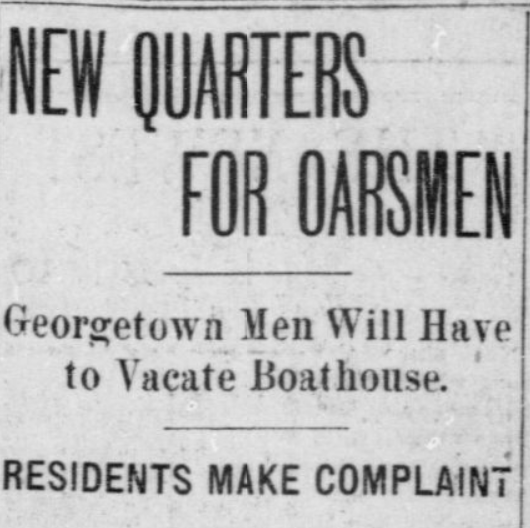 According the article the school sought a location above the Aqueduct Bridge, which would be preferable both because it was closer to the school and because “less than a quarter a mile west of [the first boathouse’s location] there is a sewer, from which pour the majority of Georgetown’s waste.” (There still is!) The site above the bridge was viewed to be cleaner and would “afford the boys an excellent opportunity for swimming after the practice.”