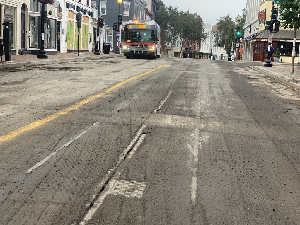 Sections of M Street between Wisconsin Avenue and Key Bridge were set in beautiful square granite blocks laid in a “fan” design. Don’t know if they were covered or eventually removed. Very treacherous in wet or icy weather, but lovely to look at.