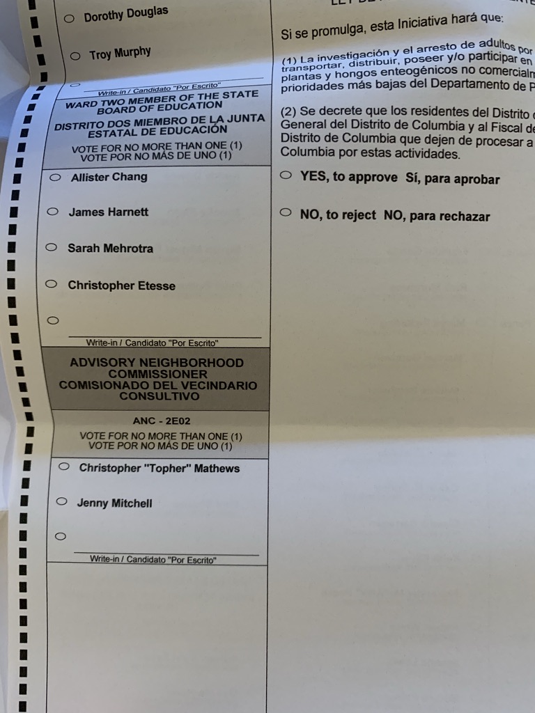 This side has four items calling for your vote, including the ANC race. If you live in my SMD, I would certainly encourage you to vote for me! But of course, please vote even if you don’t live in my SMD or want to vote for me! Just vote!