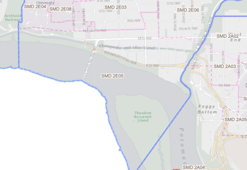And in the 20th century, the boundary of Georgetown as set forth in the Old Georgetown Act explicitly stops at the river. At first blush this would seem a meaningless distinction, since there are no homes on the island needing design approval by the Old Georgetown Board. But of course there are structures on the island, namely the memorial seen above. And were it in the boundaries of Georgetown, you can be sure that the OGB would’ve insisted on reviewing the plans! (That said, since it is federal property, the Commission of Fine Arts–the parent body of the OGB, which is the ultimate deciding body–did have jurisdiction.)
