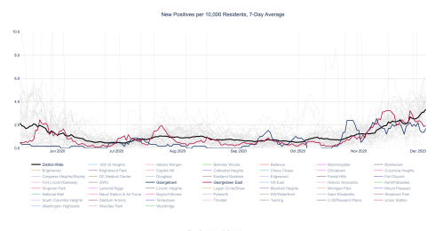 Starting in October, east Georgetown’s positive rate started increasing almost in lockstep with the city average. Although since the end of November, it has stayed about the same as the citywide average spiked again. West Georgetown’s, on the other hand, remained (and still remains) well below the city average since a brief spike in early October.