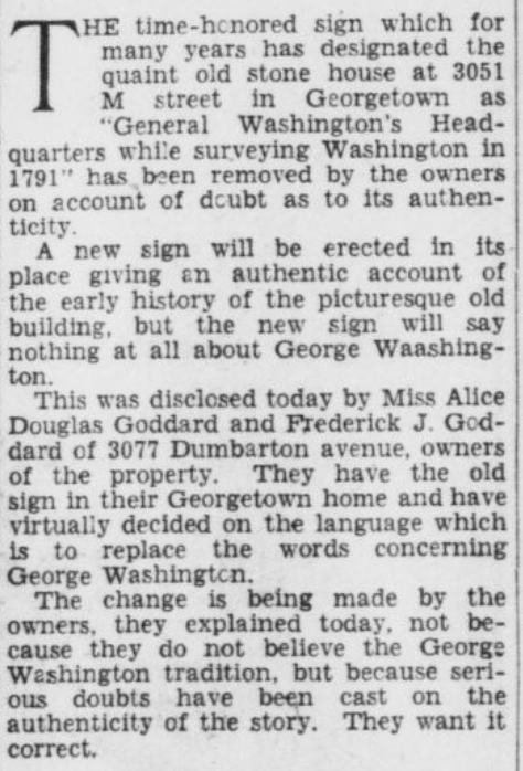The building, obviously, is the Old Stone House, which appears now pretty much exactly as it appeared in this article, dated July 5, 1932. The reason for the article was that the owners of the building decided to take down a plaque from the building claiming that it had served as George Washington’s headquarters while the city was being surveyed:
