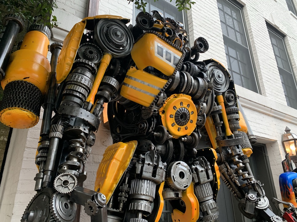 The one of the right is probably about 6 feet tall, but the one of the left is easily 10 feet. (GM’s knowledge of the Transformers is limited to the TV show of his youth, but he was under the impression Bumblebee should be shorter than Optimus Prime.) True to their inspiration, the sculptures are more than meets the eye, since they are not simply some gigantic cast moulding, but are literally made up of what appear to be actual auto parts: