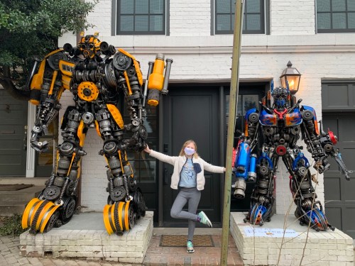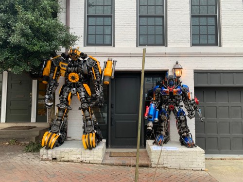Over the last week, a spectacle has emerged in front of 3614 Prospect St. Where once sat a couple nondescript boxwood bushes now stand two larger than life sculptures. Specifically, as you can see above, they are sculptures of Bumblebee and Optimus Prime from the Transformer movies.