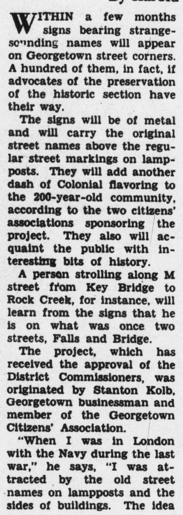 This week for Georgetown Time Machine, GM is visiting what was essentially the mid-20th century version of Georgetown Time Machine. It is an article from 1952 documenting the effort to erect supplemental street signs to identify the old Georgetown street names.