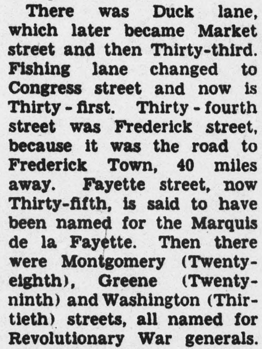 (GM’s not so sure about all of these, as he plans to explain eventually through his series. The one that seems especially wrong is Frederick. When Georgetown was founded as a town in Maryland, it was in FrederickĀ County, which seems like a much more likely source of the name, especially since the road didn’t actually go to Frederick when it was laid out.)
