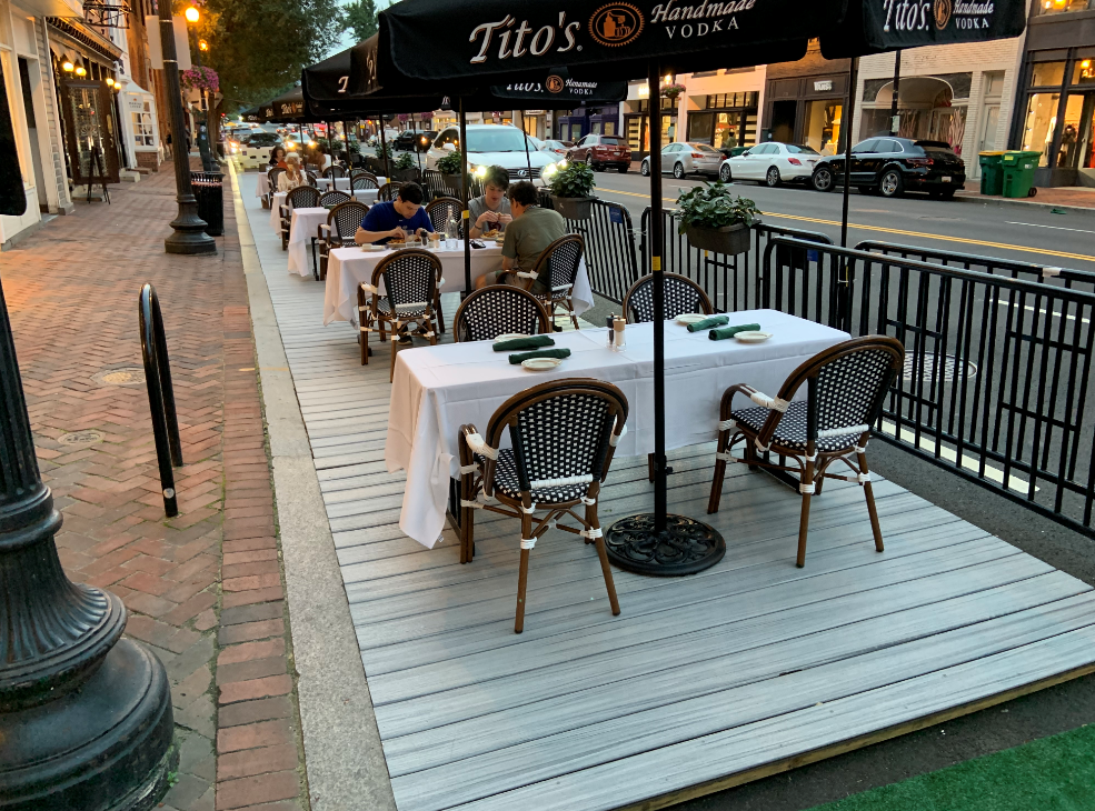 The sidewalk expansions will take the form of raised wooden platforms. Since they are at the same grade as the brick sidewalks themselves, the extension feels like a genuine expansion of the sidewalk. You can see prototype versions of this model in front of Clyde’s and Laduree, among a few other spots. They will be installed on M St. between 29th and 34th streets, and on Wisconsin between Water and Q streets. Once installed, the platforms will grow the sidewalks from an average of width 9.5 feet to 15 feet.