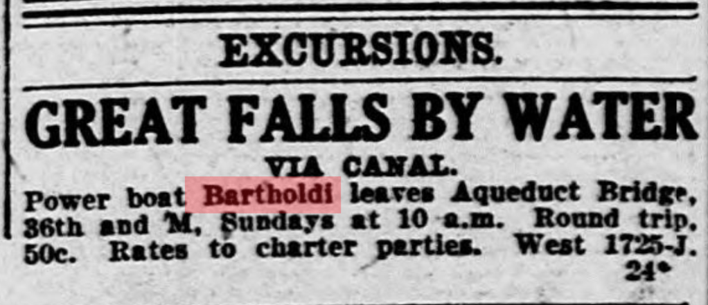 The Bartholdi was a large, Washington-based power boat active on the Canal for at least three years between 1916 and 1918. Berthed near Aqueduct Bridge, it offered chartered excursions to Cabin John, Glen Echo Amusement Park81 and the Great Falls and was a favorite of the Ramblers’ Pastime Club. This vessel should not to be confused with the steam launch Bartholdi which operated on the Canal and river during this same time period.