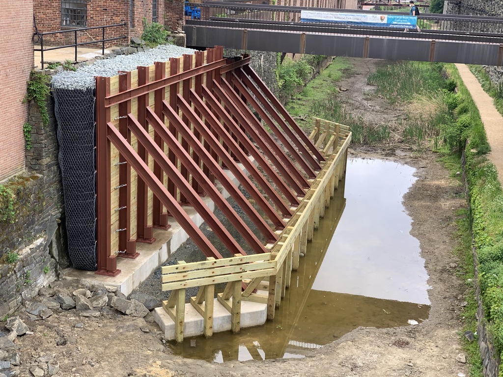 Like real flying buttresses, this structure (which is in the canal just west of Wisconsin Ave.) was put up in order to stabilize the adjoining wall. Last year, Georgetown Heritage, the non-profit that is leading the effort to restore the canal through Georgetown, became alarmed at the state of the old stone wall on the south side of the canal and the way it was bulging out. With the help of structural engineers, it determined that the wall was at risk of a catastrophic failure. It alerted NPS to the crisis and even commissioned blueprints for this support structure.