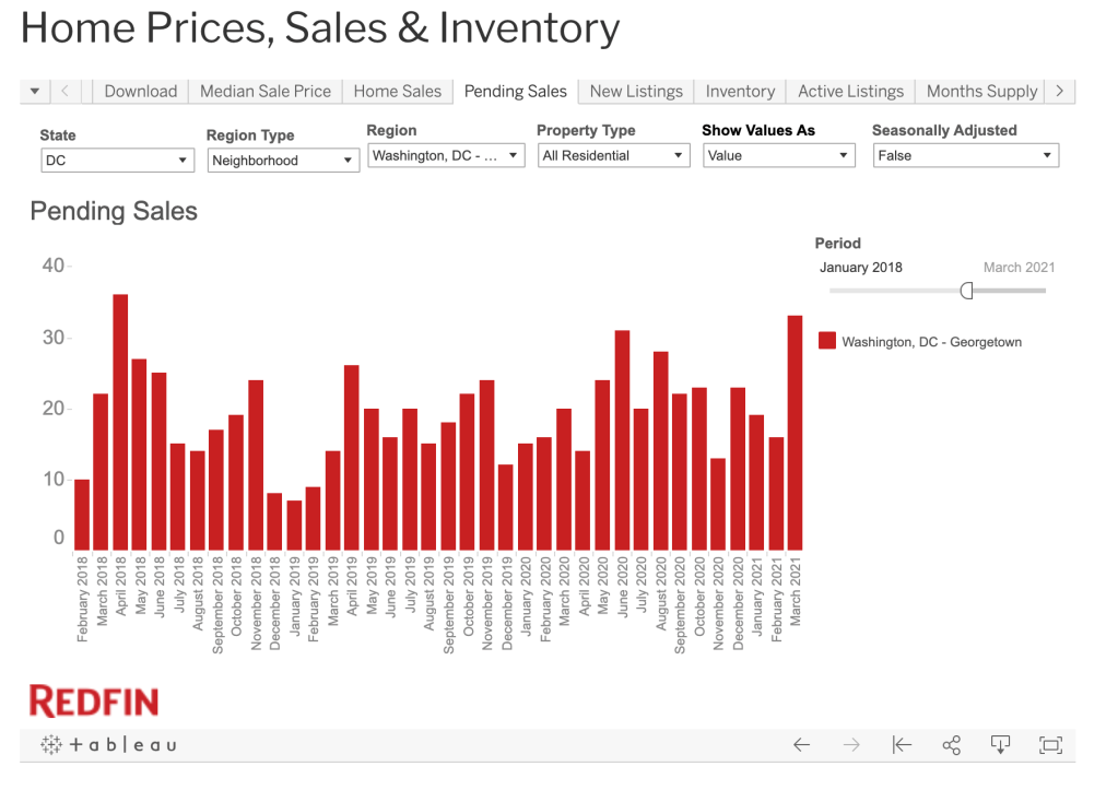 The second chart tracks the number of home sales in Georgetown. And despite there being so few homes for sale this spring, there were more homes going under contract this March than since April 2018. The buyers simply cleaned out the shelves.