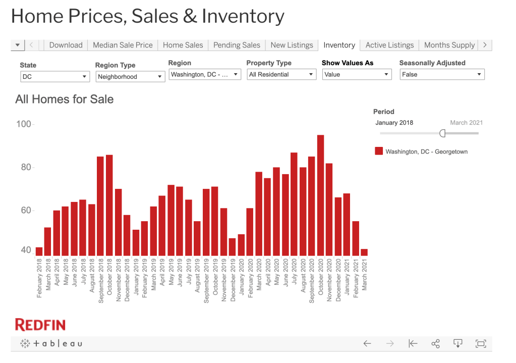 The first chart is a chart of the inventory of homes for sale in Georgetown since January 2018. As you can see, the inventory of homes for sale were on the higher side through most of 2020. But after dropping during the normal winter lull, the homes just never came back. In March 2020, there were 78 homes for sale in Georgetown. This March it was 42.