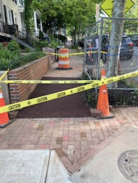 Win, win, right? Well that depends. The PFP clearly keeps the sidewalk safe (and reduces water run-off) but it doesn’t look remotely like brick. That is why the ANC (and CAG) wrote off a nearly apoplectic letter to the Mayor objecting that the PFP was illegal and an affront to the historic nature of Georgetown. On the illegal charge, the letter points out that under DC regulations, brick sidewalks in historic districts need to be repaired with bricks only. The city has cited the federal Americans with Disabilities Act as a superseding reason to proceed with their plan and has largely ignored the objections of the ANC.