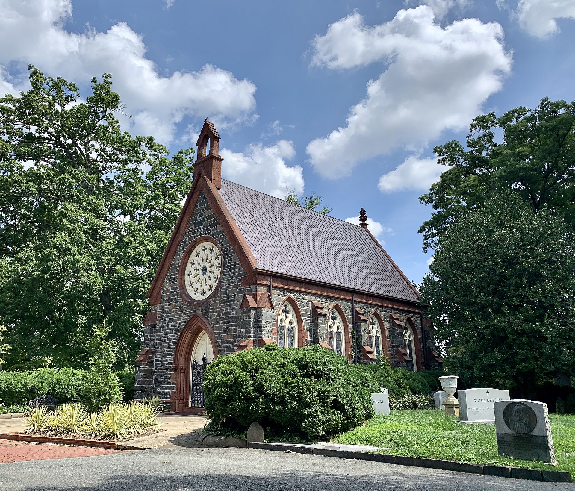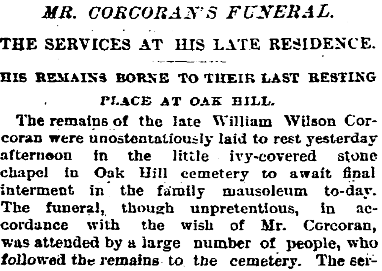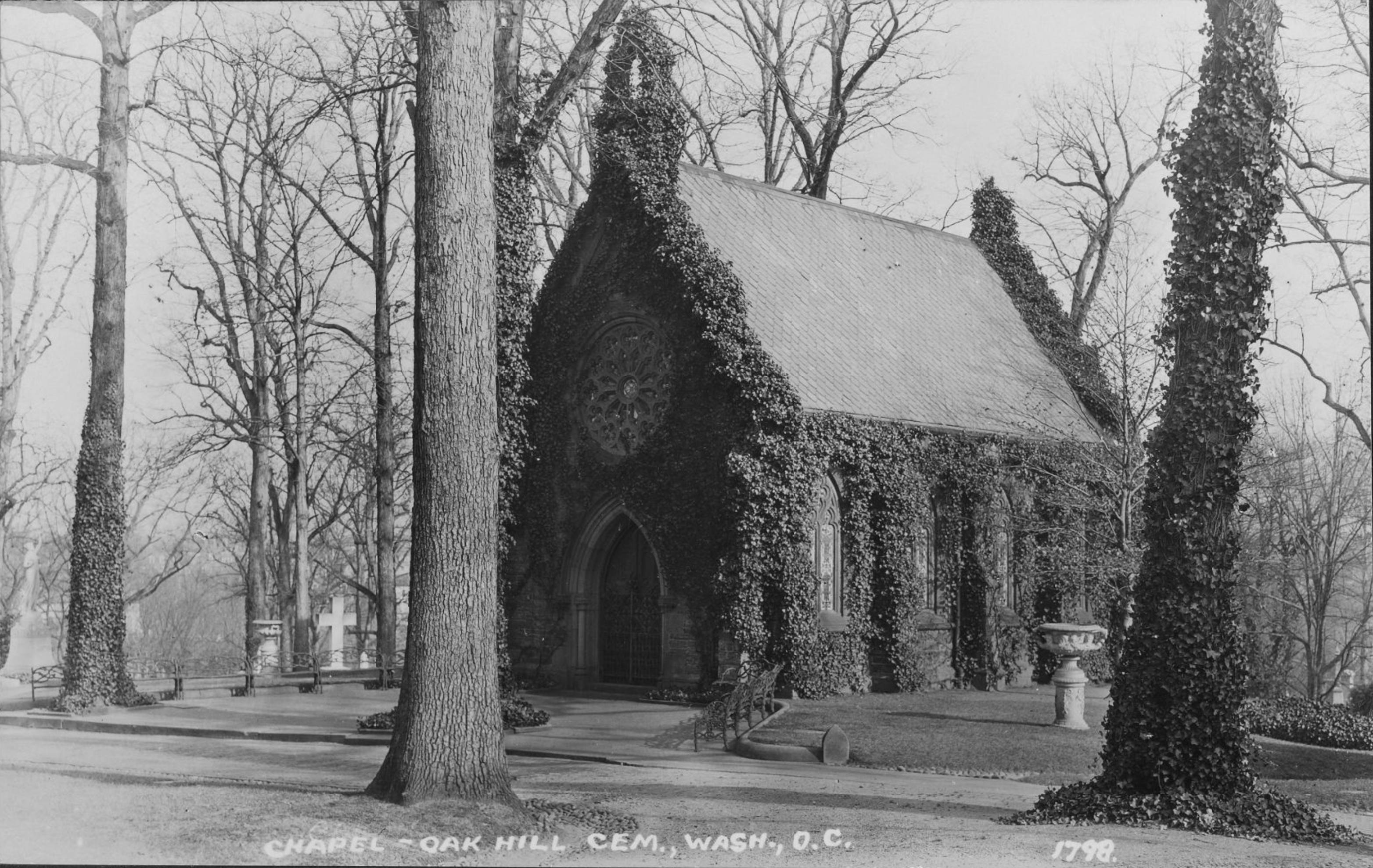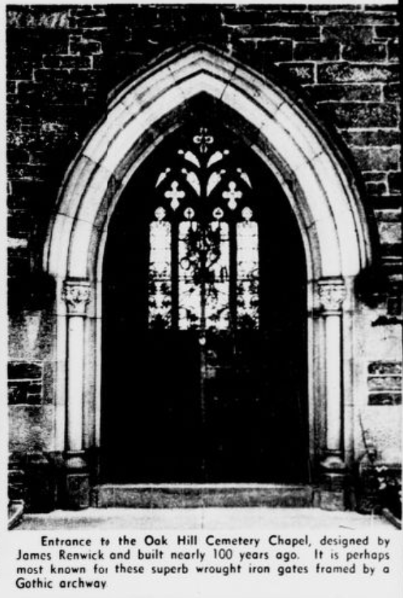 Of course one very significant thing has changed: the ivy. It covered the chapel in 1928 and is gone now. It’s unclear when the ivy was first grown over the building. It was described as “ivy-covered” in 1888 during the funeral of William W. Corcoran (who created Oak Hill Cemetery and commissioned the chapel):