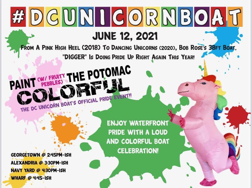 In celebration of Pride, a “loud and colorful” boat with dancing unicorns will buzz by the Georgetown waterfront this Saturday afternoon at 2:45ish.