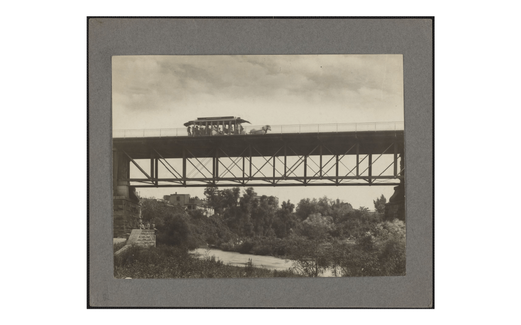 Riding across the top is a horse-drawn trolley. It would have likely been from the Metropolitan Railway, which operated from 1864 until being acquired in 1902. It ran cars along the green lines below: