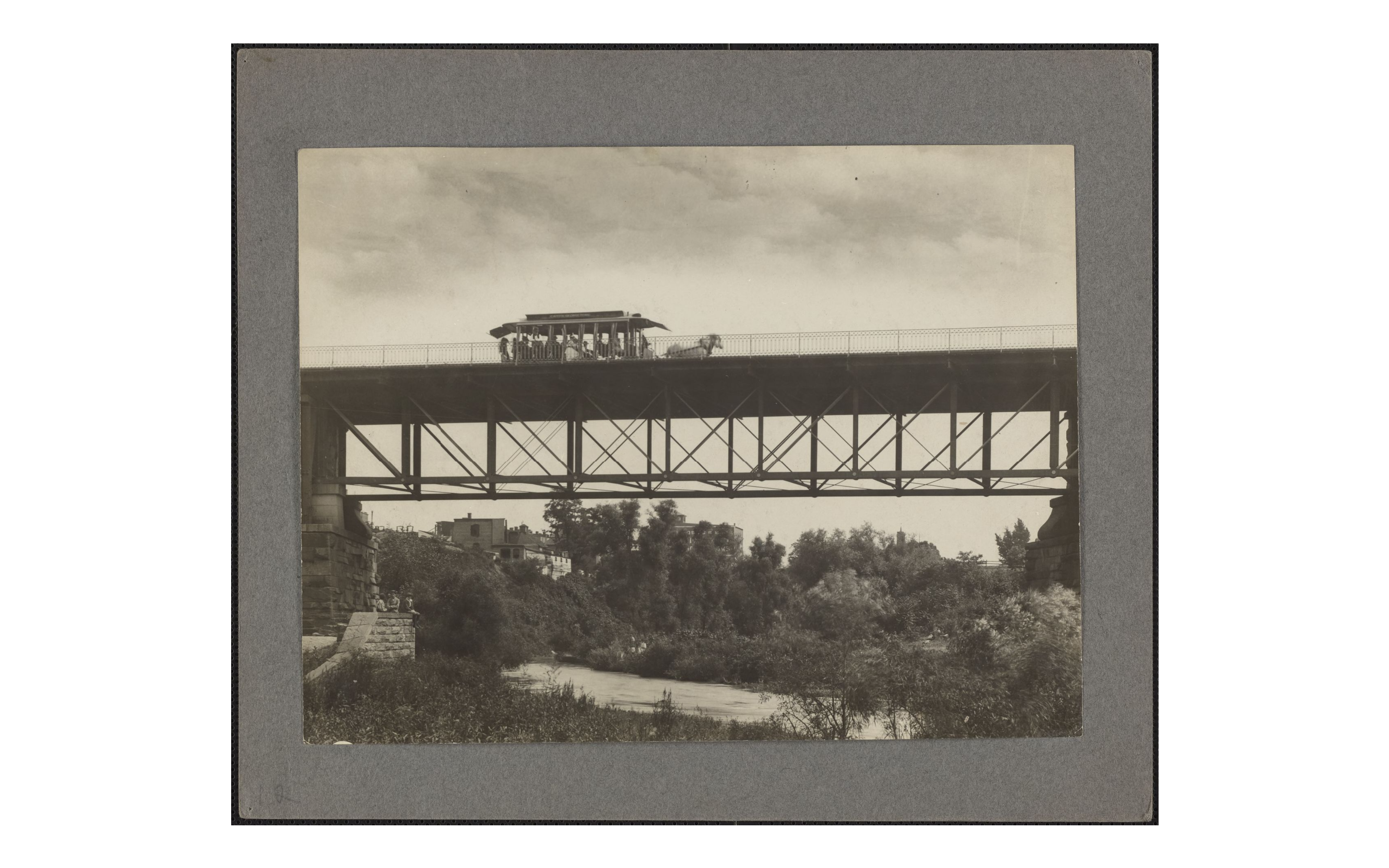 Riding across the top is a horse-drawn trolley. It would have likely been from the Metropolitan Railway, which operated from 1864 until being acquired in 1902. It ran cars along the green lines below:
