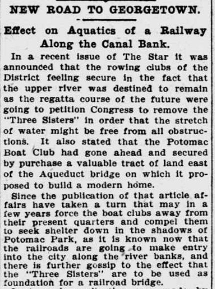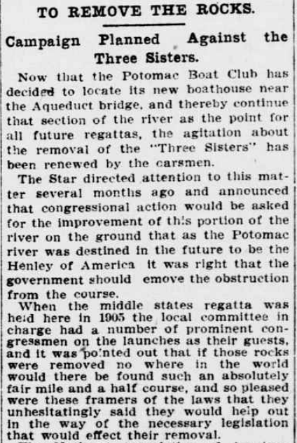 As mentioned in the article above, the arrival of PBC to this spot in 1908 (and Washington Canoe Club’s construction of its own building in 1904) brought focus on Three Sisters. This group of islands was (and remains) a bit of an obstacle for rowers and paddlers. It was hoped that they could simply be removed, and then this stretch of the Potomac could become the “Henley of America”: