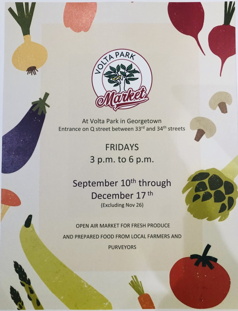 A new farmers market is coming to Volta Park Fridays starting this week. The market will take place from 3pm to 6pm and will last until December 17th.