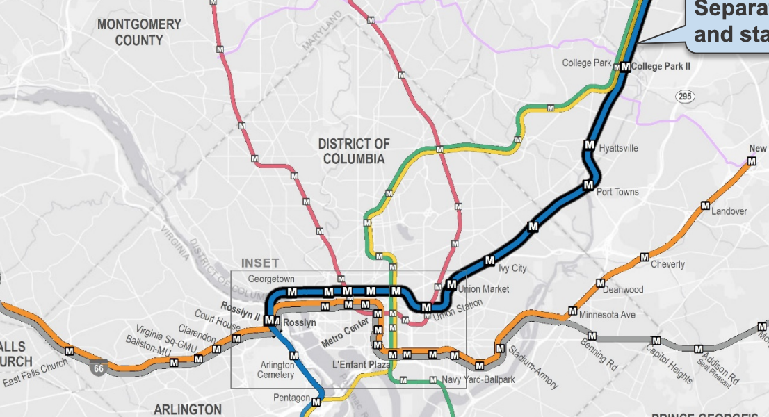 The line would travel largely the same east of Georgetown as the first one does. But the trains would head out on the Silver line tracks west of Arlington. There’s also a possibility of express service on this line between Falls Church and Rosslyn. (GM personally prefers this proposal.)