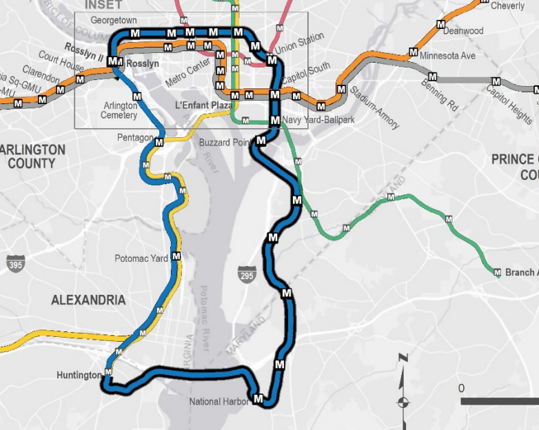 Another option would bring the line south from Union Station to National Harbor in Prince Georges County and over the river back to Alexandria: