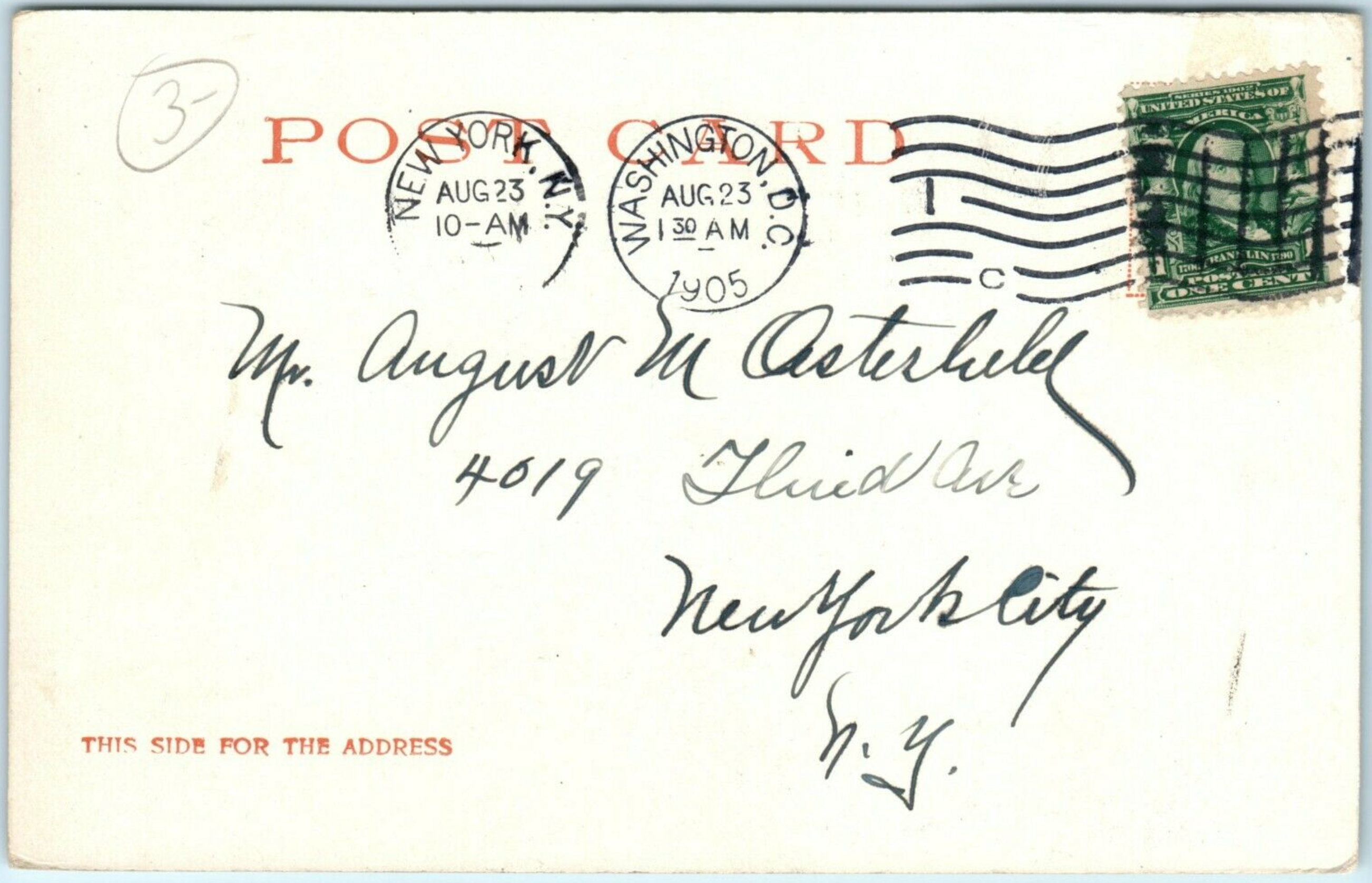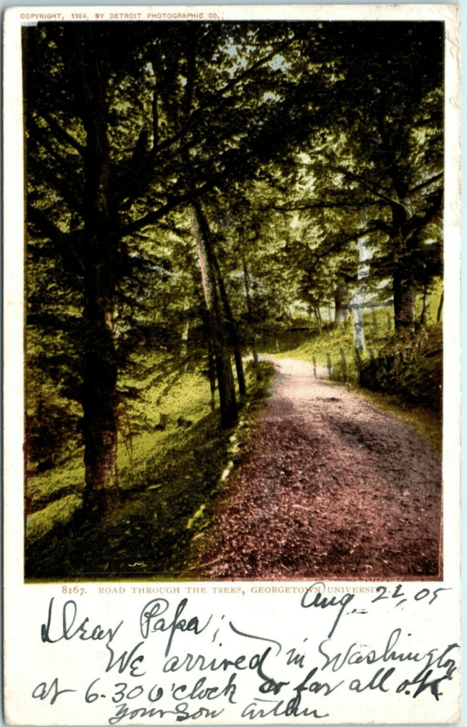 This card dates from 1905. It shows a road through the woods that is not terribly helpfully titled “Road Through the Trees, Georgetown University”. Given the subject of last week’s card, GM is guess that this too is the Walk (or the Walks). But given the date, it could be any number of possible areas around that once bucolic campus.