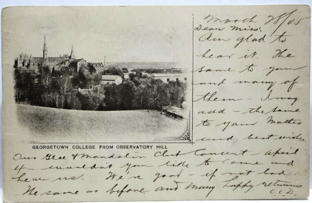This particular postcard shows a scene of Georgetown College as viewed from Observatory Hill. You can see how much more rural the western half of the campus was at the turn of the last century.